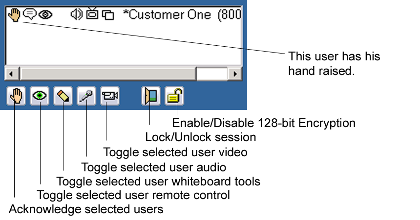 The buttons below the Attendee List only appear on the host console and it is a fast way for the host to enable or disable the attendee’s access to WebDemo controls such as video, audio(Voice Chat), whiteboard tools or remote control.